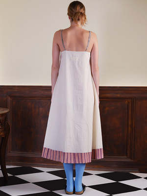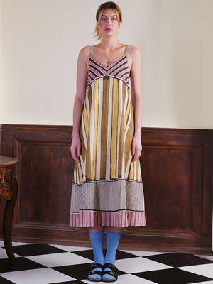 A strappy A-line relaxed slip dress with paneled vertical lines. The fabric is painted with kassim, myrobalan, alum, madder, sappamwood, and lac. Shell and lining made with 100% cotton. Techniques used: Hand painting. Length: 48.5". The model is 5'10" and is wearing a size S. Care Instructions: Do not dry under direct sunlight. Do not bleach. Iron/steam with warm heat. Hand wash in warm water. Do not soak. Each IKKIVI piece is made-to-order and crafted with care by artisans across India.