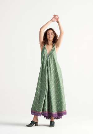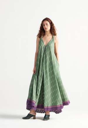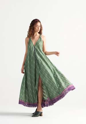 The Madeleine Green Garden Maxi Dress by IKKIVI is handcrafted by artisans across India. This feminine and fluid backless summer dress is handwoven in breathable cotton checks and cut on the bias for a flowing silhouette. It features a soft knot at the neckline, cross-back straps, practical pockets, and delicate lace detailing at the hem. The dress comes in a free size with a length of 50 inches. Material: 100% Hand-Woven Cotton. Care Instructions: Hand wash or dry clean. Use low heat iron. Pre-shrunk. Avoid direct sunlight and harsh detergents. Wash dark and light colors separately as they are hand dyed. Do not soak. The model is wearing Free Size and stands at a height of 5'7".