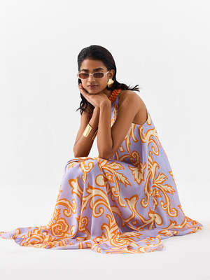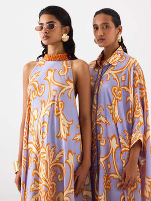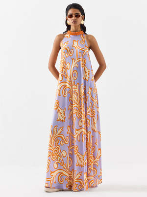 The Mojito Halter Dress is crafted from stunning vegan silk with an embroidered stone collar. Made in a digitally printed lilac damask print, this floor-length dress features halter sleeves and a back hook for easy wear. Pair it with heels for an elegant look. The model is wearing a size S. Care Instructions: Dry Clean Only. Each piece is hand-crafted with breathable, organic fabrics and unique hand-done details.