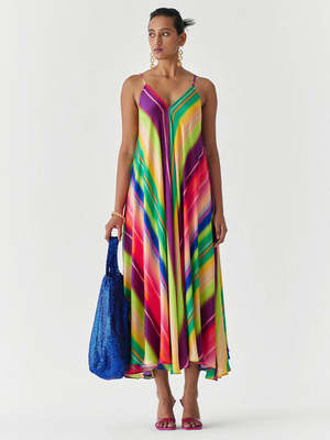 The Rainbow Strappy Dress is crafted from stunning vegan silk fabrication in a vibrant multi-color print resembling a rainbow. This trans-seasonal statement piece features adjustable straps, a V-neckline, and an A-line flared fit that can be styled in different ways. Length: 52". The model is wearing a size S. Care Instructions: Dry clean only. Each piece is handcrafted with care by artisans across India using breathable, organic fabrics and unique hand-done detailing. Please read the care tags inside the garment for specific instructions to maintain longevity.