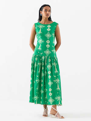 The Sago Palm Long Dress is crafted from 100% cotton and features a cabana palm print with a dropped waist. Detailed with frill and shells, the dress has a deep back neckline and a summery look with gathers on the dropped waist. It is lined and includes a center back zipper for ease. Digitally printed with lace detailing, each piece is hand-crafted with care using breathable, organic fabrics and unique trims. The model is wearing a size S. Care Instructions: Dry Clean Only.
