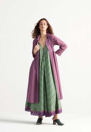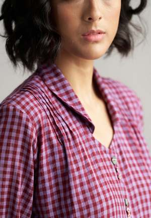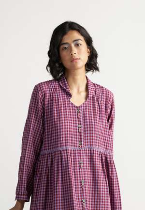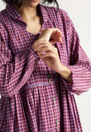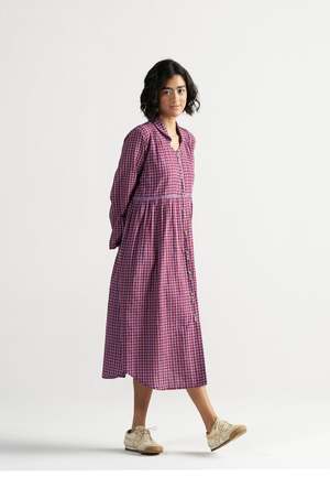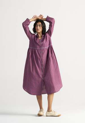 The Table For Two Tea Plum Dress by IKKIVI is a versatile piece that can be worn buttoned up as a breezy, all-day dress or left open as a charming overlay. Designed with soft gathers, playful handwoven checks and stripes, and a gentle collar for added detail. Each IKKIVI piece is made-to-order and crafted with care by artisans across India. The dress is made from 100% linen. Model is wearing size S and stands at a height of 5'6". Length: 45 inches. Care Instructions: Hand wash or dry clean, low heat iron, pre-shrunk. Avoid direct sunlight and harsh detergents. Wash dark and light colors separately as they are hand dyed. Do not soak.
