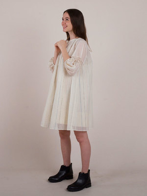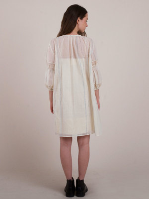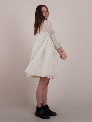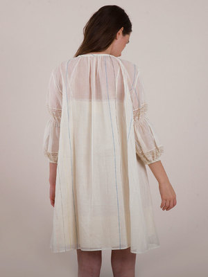 This Lilly of the Valley dress is perfect for the summer season. Featuring a semi-sheer neck-gathered design with a tie-up closure and delicate lace detailing, it also has elasticated bubble sleeves for a relaxed fit. Care Instructions: Do not dry under direct sunlight. Do not bleach. Iron/steam with warm heat. Hand wash in warm water. Length: 36". Fit: Relaxed fit. The model is wearing a size Small-Medium. Material: Handwoven Salem Cotton. Stripes naturally dyed using indigo madder, pomegranate rinds, and myrobalan. Crafted with care by artisans across India.