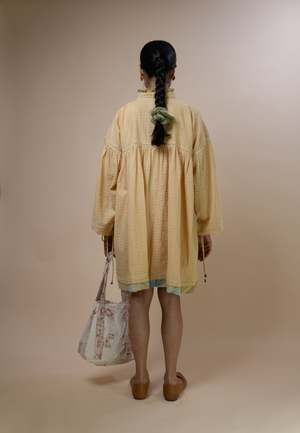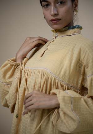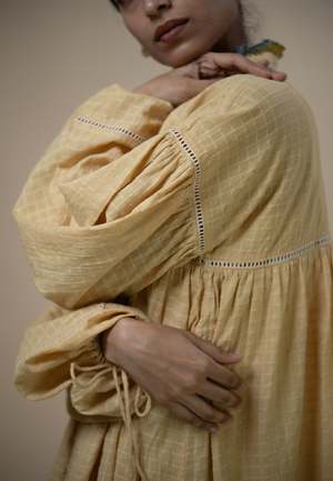 The Meadows Gathered Short Dress by IKKIVI is crafted from 100% handwoven organic cotton fibers and natural materials. It is naturally dyed using Myrobalan and Madder and features a raised neckline adorned with cascading ruffles. Hand-painted mulmul in shades of blue, yellow, and green completes the vibrant palette, with the same fabric extending into the hem for a cohesive look. Intricate details such as delicate ladder lace embellishments and ruched sleeves enhance its feminine charm. With a button closure at the front, this dress combines style and comfort, making it a versatile addition to any wardrobe. Please note that this fabric is hand spun and hand woven using traditional weaving techniques, so it may vary in colour and texture. Material: Handwoven organic cotton (100% cotton). Ambar Charkha spun, hand woven, naturally dyed, with embroidery detail and mother-of-pearl accents. Ethically made in India from seed to stitch and 100% biodegradable. Fit: Regular. The model is 53 tall and is wearing a size Medium. Garment length (inches): XXS-30, XS-31, S-32, M-33, L-34, XL-35, 2XL-36, 3XL-37, 4XL-38, 5XL-39. Care Instructions: Due to the hand-spun, handwoven, and naturally dyed nature of the fabric, variations in colour and texture may occur. Handle with care according to standard care for delicate, naturally dyed cotton garments. Production & Shipping: Each IKKIVI piece is made to order and crafted with care by artisans across India. Garments are woven, dyed, and embroidered slowly, so delivery is approximately 1518 days.