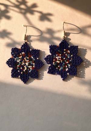 Delicate, lightweight, and full of charm, these seed bead earrings are handcrafted one bead at a time. Each pair forms a sweet flower shape using electric blue, red, green, and white beads, stitched together with precision and care. Finished with silver hooks and a jump ring, theyre airy, playful, and perfect for adding a touch of handcrafted whimsy to any outfit. As all pieces are handmade, minor variations and imperfections are natural and part of their unique charm. Colors may also vary slightly due to lighting and camera differences. Material Seed beads Product and Care Measurements: Total height: 2.5" long (including hook). Beaded flower: 2.6" across. Store safely: Keep in a soft pouch or box to prevent tangling or bead scratches. Avoid moisture: Keep away from water, perfume, lotions, and humidity to preserve the thread and bead shine. Handle gently: Seed beads are delicateavoid pulling, snagging, or bending the earrings. Wear last, remove first: Put them on after dressing and take them off before undressing to avoid catching on clothing. Clean lightly: Wipe gently with a soft, dry cloth. Avoid liquid cleaners or soaking.