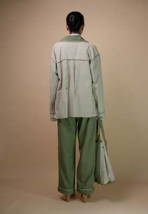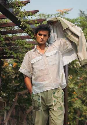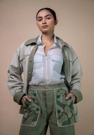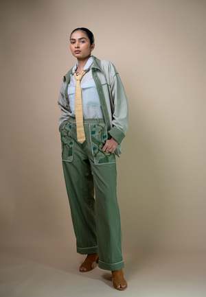 Crafted from 100% cotton fibers and natural materials, the Meadows Unisex Patch Pocket Pants are made from IKKIVI's signature Kala cotton, azo-free dyed in a soothing olive colour. Designed with a high waist and a straight-fit silhouette, they feature large patch pockets adorned with tonal hand embroidery, combining embellishments such as wooden beads, French knots, bullion knots, lazy daisy stitches, and traditional Kantha lines. This organic embroidery mimics the natural spread of moss, giving the pockets soft, uneven textures with deep, earthy greens that evoke a sense of natural tranquility. All seams are accented with piping in a checkered fabric. The foldable hem reveals the same checkered fabric on the inside, adding a subtle design detail. Please note that this fabric is hand spun and hand woven using traditional weaving techniques, so it may vary in colour and texture. Material Fabric: Kala cotton (100% cotton) Hand spun Hand woven Undyed and unbleached Wooden buttons. Ethically made in India from seed to stitch and 100% biodegradable. No plastics. No metals. Product and Care The models are 6'1" and 5'8" tall and are wearing size Medium. Fit: Regular Garment length (in inches): XXS-42, XS-42, S-42, M-42, L-42, XL-42, 2XL-42, 3XL-42, 4XL-42, 5XL-42. Care instructions: Due to the hand spun, hand woven nature of the fabric and traditional weaving techniques used, variations in colour and texture are to be expected and should be handled with care.