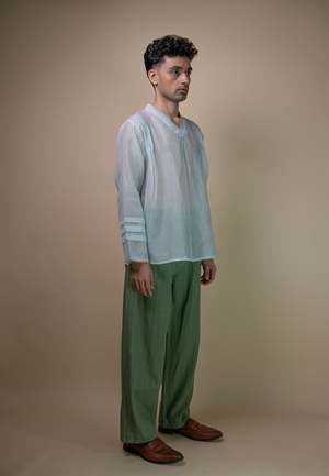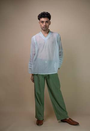 Crafted from 100% handwoven Chanderi silk, the Meadows Unisex Chanderi Shirt is azo-free dyed in a soft light blue colour. This breezy, simple top features inverted pleats at the front and a raised collar adorned with hand-painted Mulmul piping. The sleeves are accented with horizontal knife pleats and Kantha lines, adding texture and detail. This unisex staple is perfect for transeasonal wear, ideal for layering or wearing on warmer days. Please note that this fabric is handwoven using traditional weaving techniques and dyed using natural ingredients, so it may vary in colour and texture. Material Fabric: 100% handwoven Chanderi silk. Chanderi Hand woven Azo-free dyed Embroidery detail Versatile use Mother of pearl buttons. Fit & Measurements The models are 511 and 58 tall and are wearing size Medium. Fit: Regular. Garment length (inches): XXS-24, XS-25, S-26, M-27, L-28, XL-29, 2XL-30, 3XL-31, 4XL-32, 5XL-33. Care Instructions Hand wash separately in cold water, turning the garment inside out. Do not bleach. Dry in shade. Iron or steam with warm heat. Ethical Details Ethically made in India from seed to stitch and 100% biodegradable.