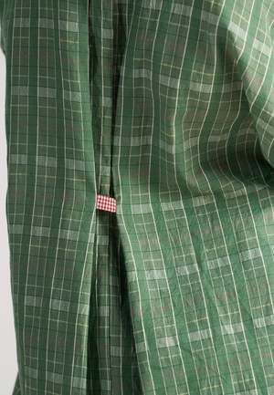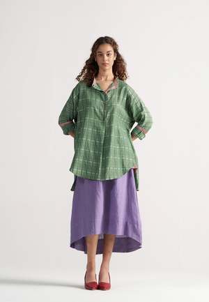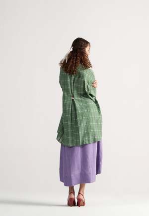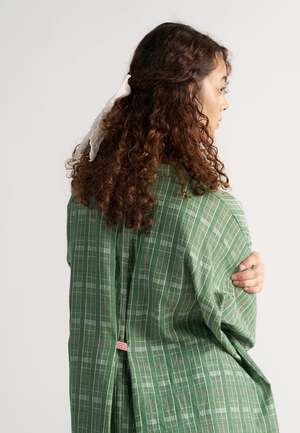 The Checkmate Shirt by IKKIVI is a relaxed, oversized button-down crafted in soft handwoven cotton checks. It features a high-low hem, drop shoulders, a back pleat cinched with a contrast loop, a half-placket front, roomy sleeves for easy layering, and thoughtfully placed pockets for added ease. Made from 100% cotton in Garden Green. Length: front 31 inches, back 34 inches. Care Instructions: Hand wash or dry clean, low heat iron, pre-shrunk. Avoid direct sunlight and harsh detergents. Wash dark and light colors separately as they are hand dyed. Made in India.
