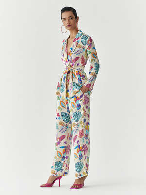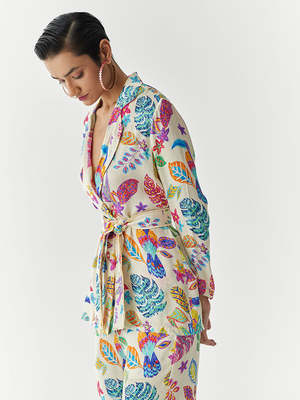 The Amazon Blazer Shirt & Trousers Co-ord Set is crafted from stunning vegan silk fabrication and features a unique Multi Amazon print inspired by the creatures of the Amazon Jungle. The blazer shirt has a lapel and front opening, paired with matching straight trousers with pockets. Featuring a belt with contrast fringe, this classic set offers a straight fit and versatile styling options. Each piece is hand-crafted with breathable, organic fabrics and detailed with one-of-a-kind buttons, trims, patches, and embroideries. Made in India.