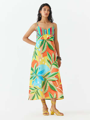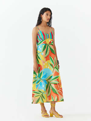 The Gir Strappy Dress by IKKIVI is crafted from 100% cotton and features a multi floral Gir print. This trans-seasonal statement piece is lined and designed with a contrast stripe yoke, relaxed fit, and adjustable straps. The dress has a summery look with gathers on the back for added detail. Each piece is handcrafted with care using breathable, organic fabrics and unique hand-done detailing. Care Instructions: Dry Clean Only. The model is wearing a size S.