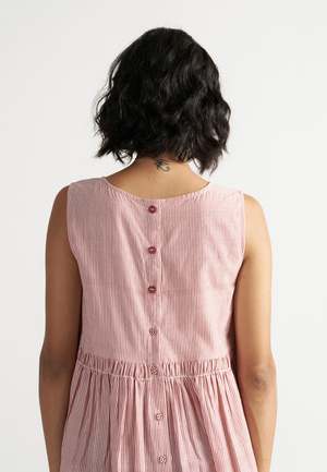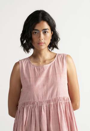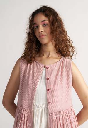 The Simply Her Crimson Line Dress by IKKIVI features a fluid silhouette with soft gathers and a flattering length. Designed to be worn as a dress or layered open as an overlay, it moves with your mood and moment. Thoughtfully finished with side pockets. Material: 100% Handwoven Cotton. The model is wearing XS and stands at a height of 5'6". Length: 44 inches. Care Instructions: Hand wash or dry clean, low heat iron, pre-shrunk. No direct sunlight, no harsh detergents. Keep dark and light-colored garments separate as they are hand dyed. Do not soak.
