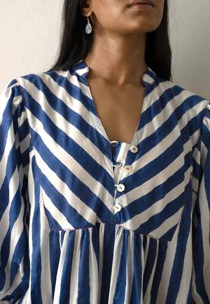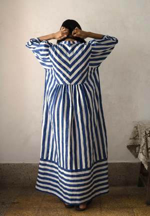The Nidar Tea Dress by IKKIVI is a striped piece that lends itself to all sorts of occasions. The relaxed fit looks great on every body type and adds style and comfort to the dress. Block-printed stripes add texture and style to the design, while the gathered sleeves and hemline complement the neckline. Different stripe directions across the panels make this piece a statement dress, with subtle red hand-embroidered details on the bodice and sleeves. Fabric: 100% cotton. Hand block printed and hand embroidered. Color: Blue and white, striped. Length: 52". Fit: Relaxed. The model is 5'3" and is wearing size M. Care Instructions: Wash in cold water. Wash separately the first few times, as natural color might bleed. Use a mild detergent. Iron on lowmedium heat. Do not use bleach or chlorine. Do not tumble dry. Do not scrub. The handwoven cotton dress can be gently washed by hand or machine washed. Wash at 30 Celsius to help keep the shape and size intact and to keep the fabric looking its best. Do not soak. Dry in shade. Each IKKIVI piece is made to order and crafted with care by artisans across India. They are woven, dyed, and embroidered slowly, which is why shipping timelines are longer than standard.