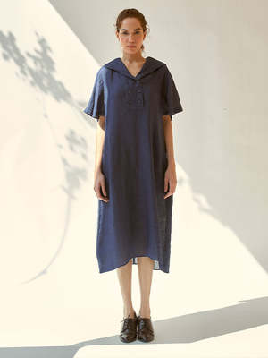 A sleek silhouette with meticulous design, the 'Anytime' dress draws inspiration from the timeless allure of Japanese culture. Featuring a button-up front, flared sleeves, and a Japanese collar, it incorporates a touch of sophistication with a modern twist. This versatile dress offers both style and grace for any occasion. Care Instructions: Hand wash, low heat iron, pre-shrunk. Before washing, always keep dark and light-colored garments separate, as they are hand-dyed. Fabric: Linen.
