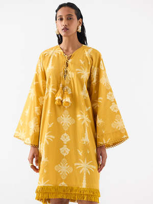 The Cabana Bell Sleeves Dress is crafted from 100% cotton slub in a cabana palm print. This trans-seasonal statement piece features a v-neckline, bell sleeves, an A-line silhouette, front strings with shell tassels, side pockets, and raffia attached at the bottom hem. The dress offers a relaxed look and can be styled in different ways. Each piece is hand-crafted with breathable, organic fabrics and unique hand-done details such as buttons, trims, patches, and embroideries. Please care for this handcrafted garment to maintain its longevity.