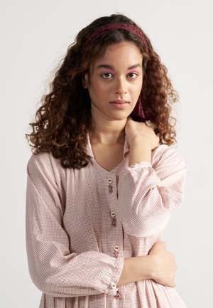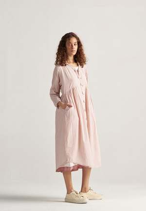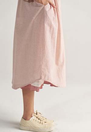 The Table For Two Regular Grid Dress can be worn buttoned up as a breezy, all-day dress or left open as a charming overlay. Designed with soft gathers, playful handwoven checks and stripes, and a gentle collar. Fabric: 100% Handwoven Cotton The model is wearing size S and stands at a height of 5'6". Length: 45 inches. Care Instructions: Hand wash or dry clean. Low heat iron. Pre-shrunk. Avoid direct sunlight and harsh detergents. Wash dark and light colors separately as they are hand dyed. Do not soak.