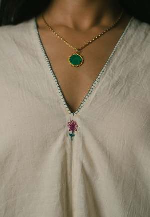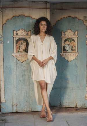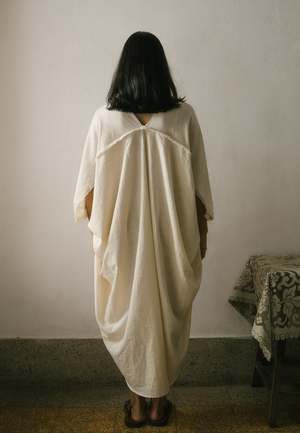 VALUES Handcrafted Organic Fair Minimal Waste Traditional Each IKKIVI piece is made to order and crafted with care by artisans across India. They are woven, dyed, and embroidered slowly, which is why shipping takes longer than standard timelines. This free size kaftan-style tunic features hand-embroidered detailing on the neckline. It is calf length from the back with drop shoulders. Crafted in soft, unbleached cotton, this kaftan can be styled in multiple ways and is truly versatile. Material Fabric: Handwoven cotton. The cotton is unbleached and undyed, kept true to its natural color. Product and Care Color: Off-White Length: 36" Fit: Relaxed The model is 5'3" and is wearing Free Size. Care Instructions: Wash in cold water. Wash separately the first few times (natural color might bleed). Use a mild detergent. Iron on low-medium heat. Do not use bleach or chlorine. Do not tumble dry. Do not scrub. This handwoven cotton dress can be gently washed by hand or in a machine. We recommend washing the fabric at 30 Celsius to keep the shape and size intact and to keep it looking its best. Do not soak. Dry in shade.