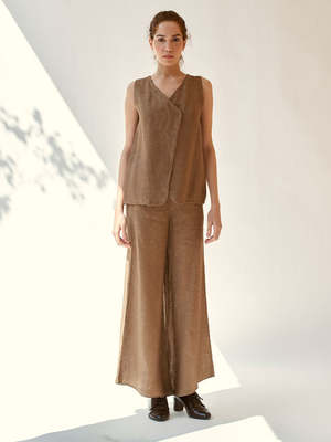 The 'Just In Time' set is designed for minimalists who appreciate simplicity in style. It features a beautiful overlap waistcoat with front hooks and relaxed-fit pondi pants. The pant includes a handy pocket for added functionality. The set fits loosely. The model is 5'8" and is wearing size S. Length: Top - 25 inches; Pant - 36 inches. Care Instructions: Hand wash or dry clean, low heat iron, pre-shrunk, avoid direct sunlight and harsh detergents. Keep dark and light-colored items separate as they are hand dyed. Fabric: Linen