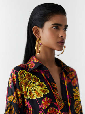 The Rainforest Shirt & Pants Set by IKKIVI is crafted from vegan silk with a hand-drawn Amazon forest inspired Rainforest print and multi-color fringe detailing on the placket. The boxy shirt features a front opening and a relaxed silhouette, paired with matching trousers with a center zipper and pockets. Each piece is hand-crafted with breathable, organic fabrics and unique hand-done details. The model is wearing a size M. Care instructions: Dry clean only. Made in India.