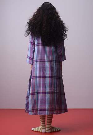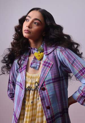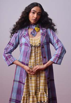 The Lamara Jacket by IKKIVI features pretty hues of lilac, lavender, purple, and rose pink woven like brushstrokes on handspun handwoven cotton. The relaxed silhouette and clean, tailored collar make this jacket a versatile piece to pair with endless options. Jacket Length: 47 in / 173.7 cm Model is 5.7 ft / 152.4 cm tall and is wearing size Small. Model's Body Measurements: Bust 32 in / 81.28 cm, Waist 26 in / 66.04 cm, Hip 30 in / 76.2 cm. Care Instructions: Dry clean recommended. If washing at home, use mild/gentle hand wash in cold water. Machine wash separately on gentle cycle without detergents. Do not soak. Handcrafted by artisans across India.