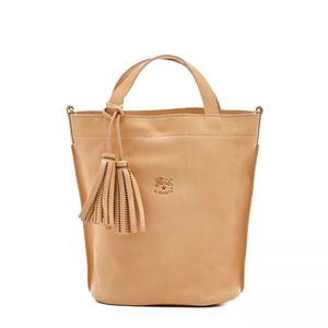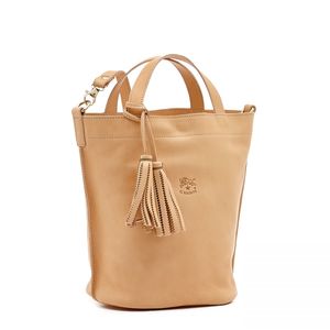 A shoulder bag with removable tassels, made of vegetable tanned cowhide in Italy by master craftsmen in Il Bisonte's 30 km supply chain. Can be carried by its two short handles, or worn cross-body with the adjustable and removable shoulder strap, attachable with brass snap-hooks. Removable cowhide lace with two tassels. Snap button closure. The unlined interior contains a leather pocket. Made by Il Bisonte in Italy CONTENT & CARE: 100% Cowhide with brass hardware