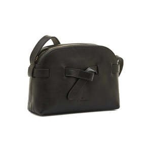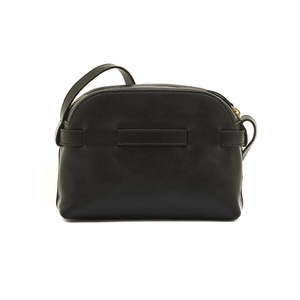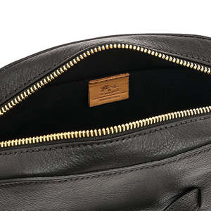 The Elisa Cross Body Bag by Il Bisonte is a small crossbody crafted from vegetable-tanned cowhide leather. It features a unique leather strap that circles the body, an adjustable shoulder strap with a brass stud, and a zip closure with a leather pull. The interior is lined in cotton canvas and includes a small open pocket. Made in Italy. Materials: 100% Cowhide with brass hardware; Cotton canvas lining. Measurements: 2.4 x 6.3 x 8.7 inches.