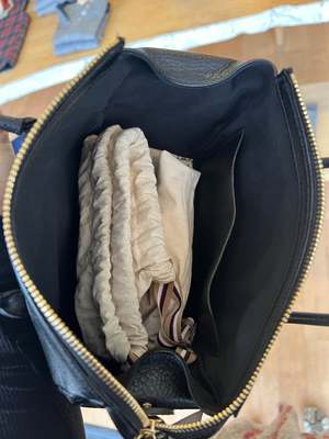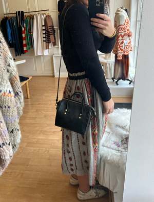 Small handbag with double handles, and adjustable shoulder strap, removable via snap-hook. Made of vegetable tanned cowhide in Italy. Zippered closure with brass and hand-woven cowhide pull. The interior, lined in cotton canvas, contains a cowhide pocket. 7,28(W), 5,71(H), 4,53(D) inch Handmade in Italy