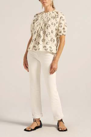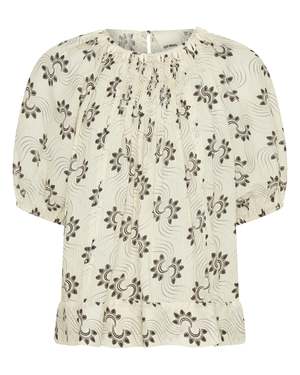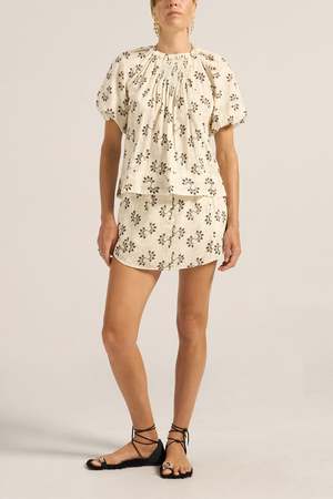 The Moira Top is crafted from a soft cotton voile, printed with swirl motifs and embellished with delicate beading and sea shells. It features a softly gathered neckline, hand-smocking at the front chest, a button closure at the back, and rich puffed sleeves. Flowing loosely from the neckline, the top falls to a shorter, hip-skimming length, making it perfect paired with the Abas Skirt for an easy, sun-ready ensemble. 100% Cotton. Type: Tops.