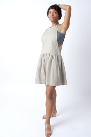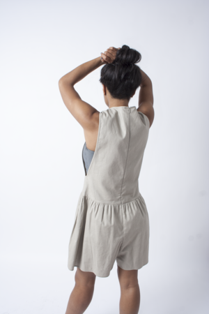 A tank romper in Tan linen featuring deep armholes, drop waist, and full, gathered shorts. We love the versatility of this bad boy wear it over a tee, tank, bralette, or nothing at all if you're feeling saucy. Center back zip closure 55% Linen, 45% Cotton Dry clean Made in the USA ** This item is FINAL SALE Nicole is 5'2" and wearing size P. Emmy is 5'3" and wearing size P.