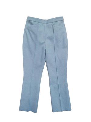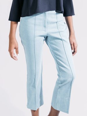 Mid-rise, fully lined trousers with front western pockets, back welt pockets, a covered front fly with a hook and bar closure. Stylized tuck pleats on each leg with a kick out flare at the ankle. - 100% Cotton - Model is 5'9 and wears size XS - Laid flat, XS measures 14" across waist, 19" at hips, 36" length, 11" rise, 26" inseam, 9" leg opening - Dry clean only - Made in New York