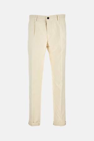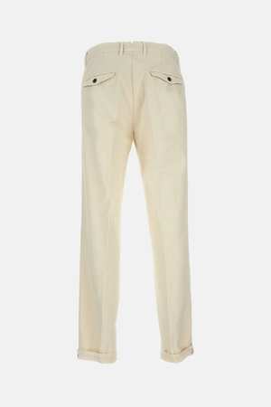 Men's tailored cotton trousers with zip and button closure, belt loops, and back flap pockets. Cream color. Composition: 100% Cotton.