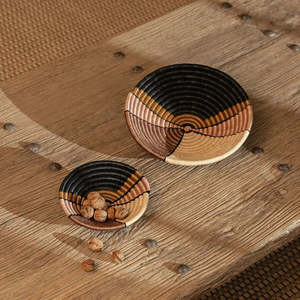 One of our best-selling signature plateaus baskets made in Rwanda with a one-of-a-kind handwoven design. - 12" W x 3" H - Hand-dyed in a variety of colors including dark blue, tan, and blush - Made from strands of sisal and raffia wrapped around bunches of sweetgrass - Includes a loop on the back for hanging - Made from locally sourced fibers - The ideal housewarming gift and the perfect shape and size to be used as a fruit basket hung in a cluster on a gallery wall or simply placed as an accent piece in your favorite nook around the house or office. *Due to the handmade quality, some size and color variation may occur. Care Instructions - spot clean - bright colors will fade in direct sunlight