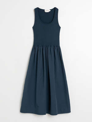 The Poplin Dress from Indi & Cold is an easy, everyday style crafted from 100% woven cotton. Designed with a fitted ribbed bodice and a softly gathered skirt, it features a round neckline and a sleeveless cut for a comfortable, flattering silhouette. - 100% Cotton (woven) - Sleeveless midi dress - Round neckline - Ribbed fitted bodice - Gathered skirt - Lightweight, breathable fabric - Made in Spain