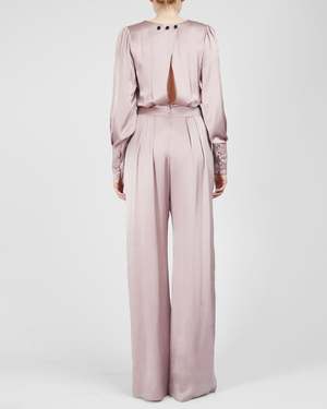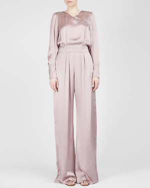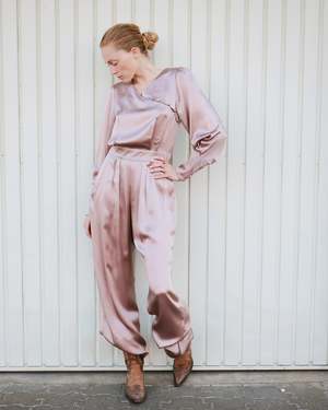 Our collectsions are all about subtle yet striking detail. This elegant silk jumpsuit is designed with a wide-leg cut and gently draping sleeves that gather in buttoned cuffs. The blousy silhouette has a fitted waist and eye-catching back slit. A great garment that combines feminine novelty and every-day comfort. The long pants should touch the floor and are currently fitted on a tall person or high heel lover. Thanks to a straight cut, it will be easy to adjust the length to your perfect measure. Styling tip: Polished gold accessories or contrasting waist belt PRODUCT DETAILS fitted waist with invisible zipper in CB 100% Silk Charmeuse color: Dusty Rose fit model wears size M made in New York