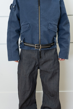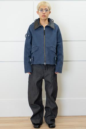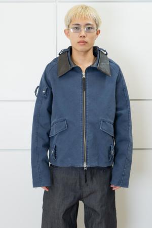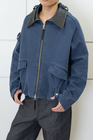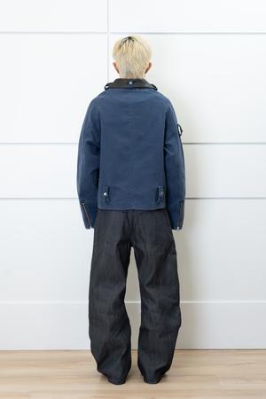 A cropped workwear jacket featuring a detachable leather collar. Made from washed canvas that develops a faded, vintage look. Equipped with a two-way zipper with leather pull tabs. Eyelets at the hem and along the sleeves and back collar allow for styling customization or accessory attachment. Zippered cuffs add functional detail. Fabric: 100% Cotton Made in China. Runs small; we recommend sizing up one size. Model is 5'9" and 125 lbs, wearing size L. Size chart (in cm; manual measurement may result in a 12 cm margin of error): S: 1/2 Chest 59, Sleeve 79, Length 63 M: 1/2 Chest 61, Sleeve 80.5, Length 65 L: 1/2 Chest 63, Sleeve 82, Length 67 XL: 1/2 Chest 65, Sleeve 83.5, Length 69.