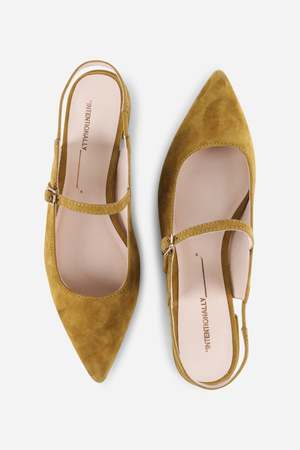 Meet ESCAPE, a minimal almond-toe skimmer thats anything but basic. Created in soft, lightly textured kid suede, this easy slip-on staple pairs perfectly with socks, tights, or bare skin. Style details and materials: - Kid suede upper - Leather lining - Rubber outsole - Gold buckle closure - Heel height: 0.75" - Memory foam footbed Made in China.