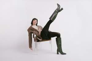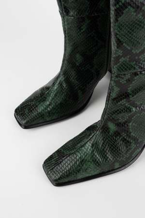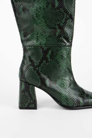 The TGIF knee high boot by INTENTIONALLY __________. features an embossed snake print in forest green leather. Made in China. Style No: ILE3-1105