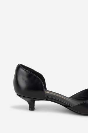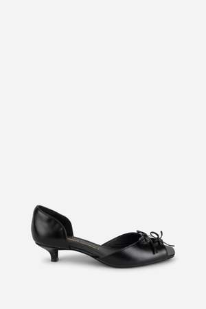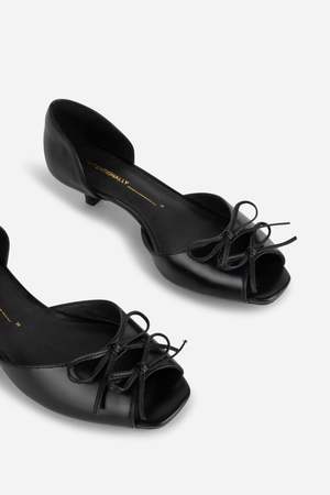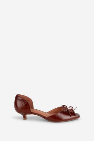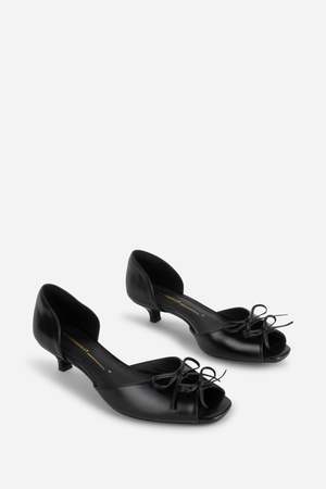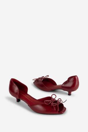 The Carol Peep Toe Kitten Heel is a vintage inspired leather dress shoe featuring peep toes, side cutouts, monochromatic detailing throughout, and delicate bows on the upper. It includes a padded leather footbed for comfort and a low heel similar to the brand's Curfew style.
