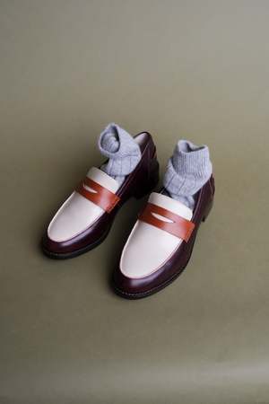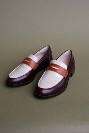 The Next Door Penny Loafer by INTENTIONALLY __________. features a tri-tone colorblocked design in merlot, cognac, and ivory. This loafer has menswear-inspired details with a perfectly rounded toe shape and rich leather color combinations. Heel height: 1.25". Oil leather upper, leather lining, rubber outsole, memory foam footbed. Made in China. Style number: IYE3-1901.