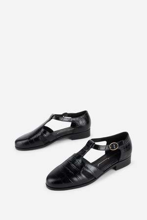 The Eureka T-Strap Flat blurs the line between sandal and shoe with its 90's inspired Mary Jane design. Featuring rich leather uppers, an almond toe shape, padded footbed, and upper cut outs for a modern look. Ideal for layering with socks.