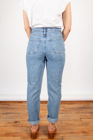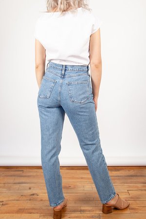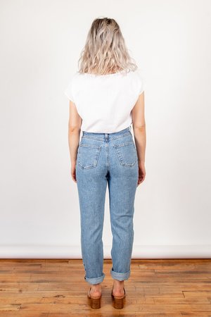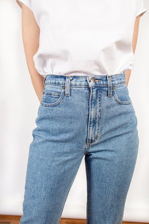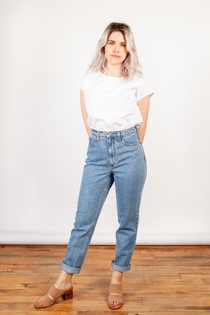 So soft, so sexy. Iris Denim's first 100% cotton jean is the wardrobe staple of your dreams! A medium blue wash with tonal stitching, 4 pocket design, a true high rise and crop straight leg. This style runs true to size. Because it is a non-stretch jean, the fabric will give with wear. 11.5" front rise, 28" inseam Made in Canada. Material: 100% Cotton Model is 5'8" and wears a size 26.