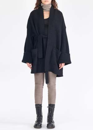 Isabel Benenato's short wool coat is crafted from a soft and cozy wool-polyester with yak knitted sleeves. This short wool coat features patch pockets, a removable belt, dropped shoulders, a shawl collar, and wide ribbed cuffs. regular fit body: 90% wool, 10% polyester sleeves: 54% wool, 22% yak, 19% polyamid, 5% elastane dry clean only