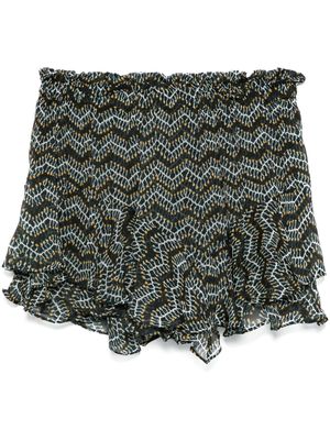 Short ruffled shorts in printed faded black Elastic waist Rows of frills Flared and flowing cut Fabric: 100% Viscose Dry clean only Made in India Measurements: Rise: 14 1/4" (Measured from Small)