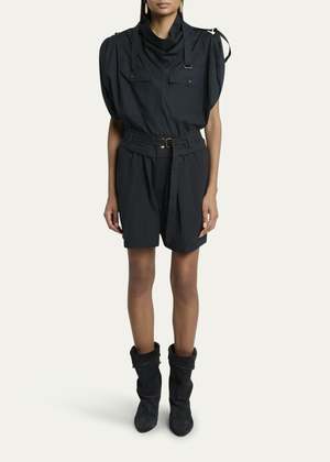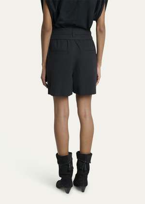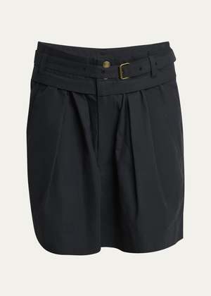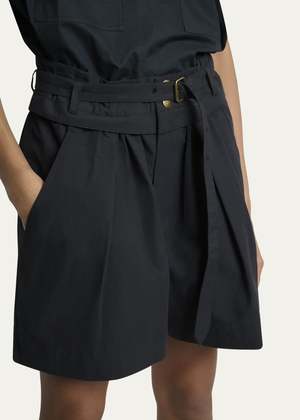 Sporty plain-coloured crisp cotton shorts with a fitted waistband and loops. Features a matching removable belt with metal buckle, visible snap buttons, and a hidden zipper. Gathered waist, Italian pockets on the sides, raglan pockets in back, and turn-up hems. Antique gold-finish metal details. High waist, short length, loose fit. 70% Cotton, 30% Polyamide. Delicate wash at 30, wash and iron inside out only. Made in China. Fit is true to size. Take your regular size.