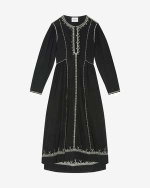description: Cotton dress with long sleeves Round neck Welt pockets on each side Front button closure Embroidery patterns Gathers details Underdress included fabric: 100% Cotton