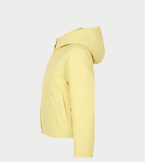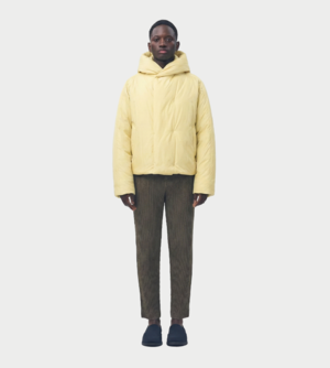 This short light yellow jacket features an oversized silhouette with a concealed button front, hood, and side pockets. The Duvet Jacket has a minimalist design accented with plush polyester padding for added warmth and comfort. Vendor style: HP58FC271. Fabrication: 100% Nylon. Lining: 100% Polyester. Filling: 100% Polyester. Made in Japan.