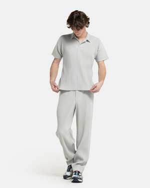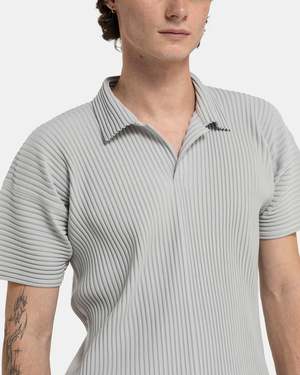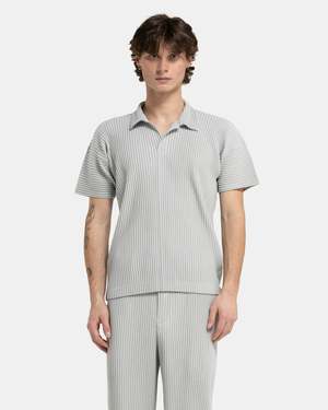 Homme Pliss Issey Miyake Basic Polo Shirt in Light Grey The Basic Pleated Polo Shirt is constructed of the brands heat-set pleated fabric, providing a unique boxy fit. The shirt is finished with an open polo collar without buttons. - 100% Polyester. - Made in the Philippines. - Machine wash cold, line dry. - HP49JM430. Ben is 5'10 (177cm) and is wearing a size 2.