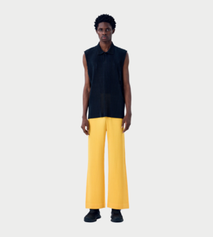 This collared sleeveless top is made from quick-drying, airy mesh material. It is designed to be thin and soft with minimal tautness. It is characterized by its soft texture despite its sporty feel. It has pockets on both sides. Vendor Color: Black. Vendor style: HP51JM371. Fabrication: 100% Polyester. Made in Japan. Machine wash cold. Gentle cycle. Do not tumble dry. Line dry in the shade. Do not iron. Do not dry clean. Wash in a mesh bag with like colors.