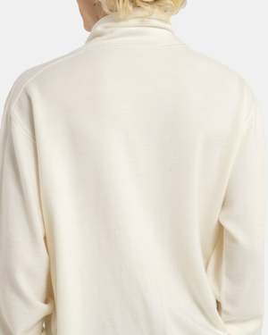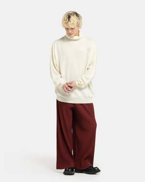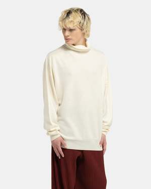 Homme Pliss Issey Miyake Wool Smooth Turtleneck in Ivory The Wool Smooth Turtleneck is warm and lightweight with a densely-knit construction. The sweater has a relaxed fit with rib-knit hems, and a fold-over high neck design. - 100% Wool. - Made in Japan. - Dry clean. - HP48KN215. Oak is 5'10 (178cm) and is wearing a size 3.