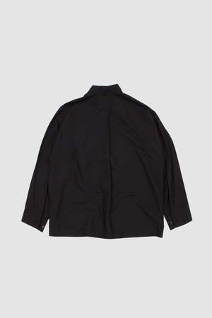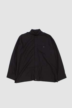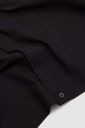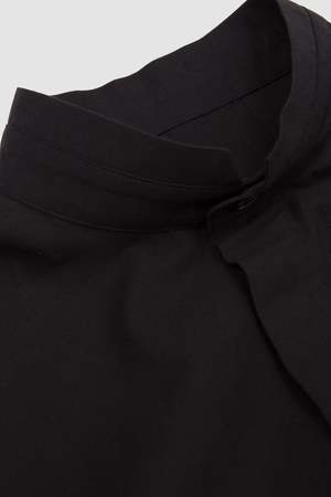 This long-sleeved black shirt features a distinctive scarf-like neckline, a concealed button front, and a chest pocket on the left. STREAMLINE SHIRT is made from 100% cotton fabric, specially treated to create its distinctive wrinkled texture.