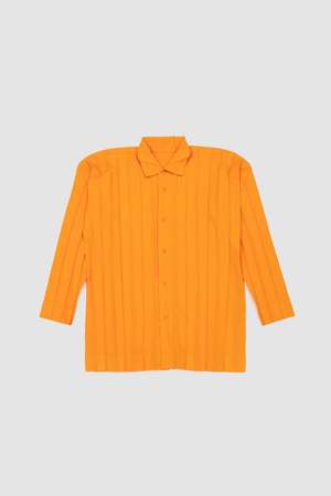 This long-sleeved pleated button-up shirt in orange has a regular collar and side slits. EDGE ENSEMBLE offers summer suiting styles. The hand-pleated wide accordion pleats and a semi-gloss finish give a relaxed air.
